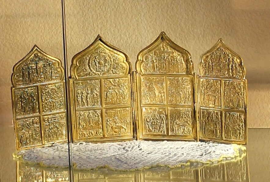 В народе его называли «утюг», потому что в сложенном виде он очень напоминал этот предмет. Представленный вам складень− литая икона XIX века «Большие праздничные створы с кокошниками», в клеймах которого изображены сюжеты из цикла церковных двунадесятых праздников и Богородичные иконы.